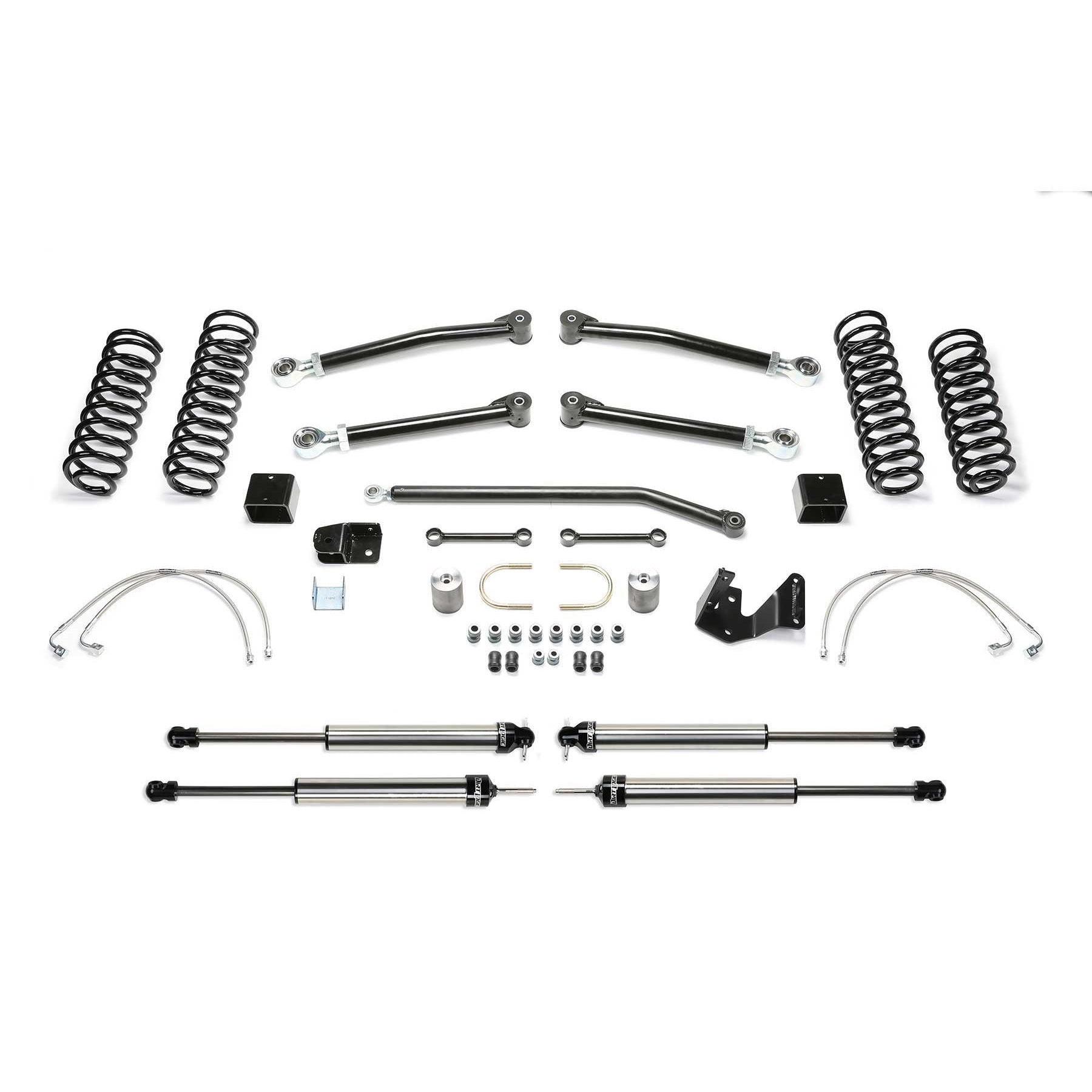 Utilizing the factory link arm mounts Fabtech's Trail short arm suspensions are built for aggressive offroad use while providing a smooth and quite highway ride. Each system has features and benefits that address all variants of off highway travel use including rock crawling, aggressive trail use and overland expeditions. The Trail system replaces the four lower link arms due to their vulnerability to offroad obstacles. Link arms come with large poly urethane bushings on one end with internal threads on the other to accept the ground breaking Fabtech 5 Ton Joint for longevity and a quite ride. These systems utilize Fabtech's Standard coil springs that are a single rate design and provide great all around suspension performance. Factory load carrying capacities are retained in these quality springs. Includes Lower Short Arm Links Front & Rear, Standard Coil Springs Front & Rear, Adjustable Track Bar Front, Sway Bar Links Front, Track Bar Bracket w/ Support Rear, Brake Lines Front & Rear, E Brake Bracket, Front Bump Stop Extensions, Rear Bump Stop Brackets and Dirt Logic 2.25 shocks.