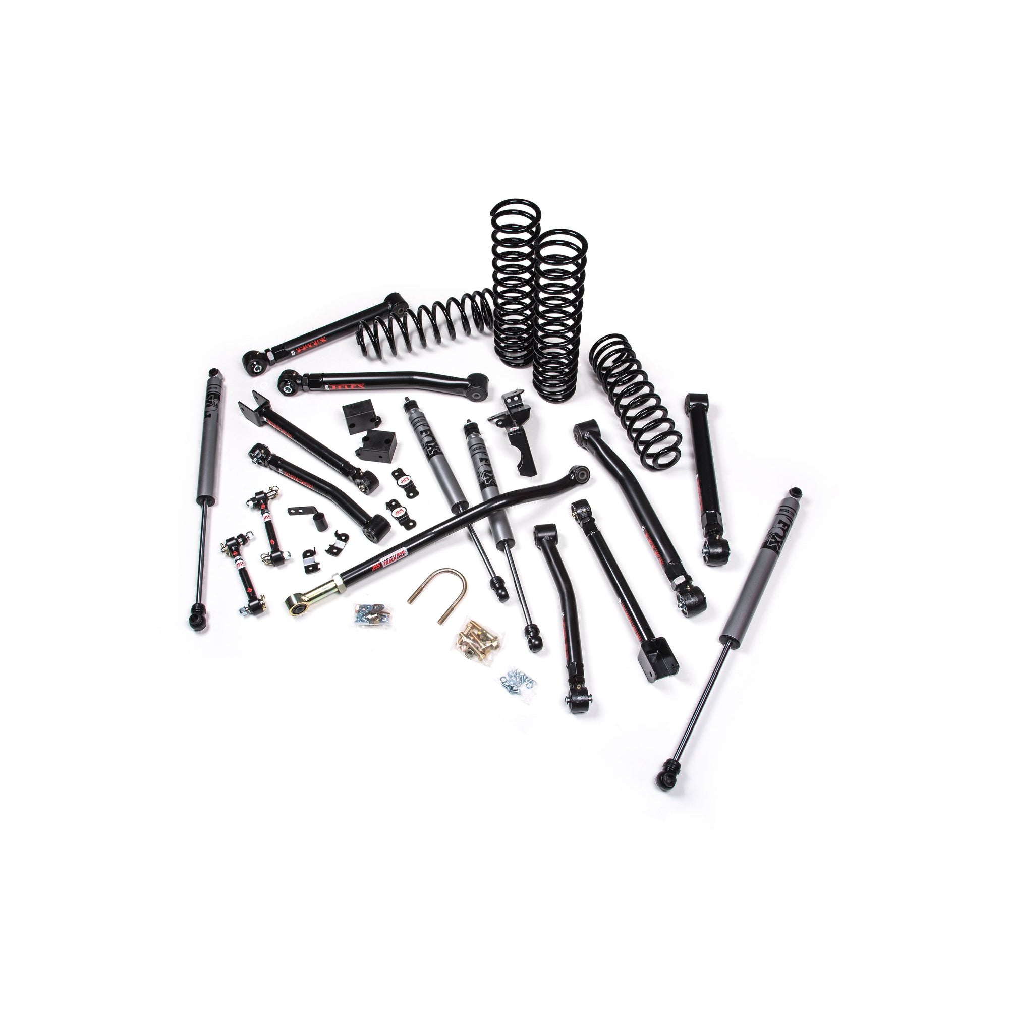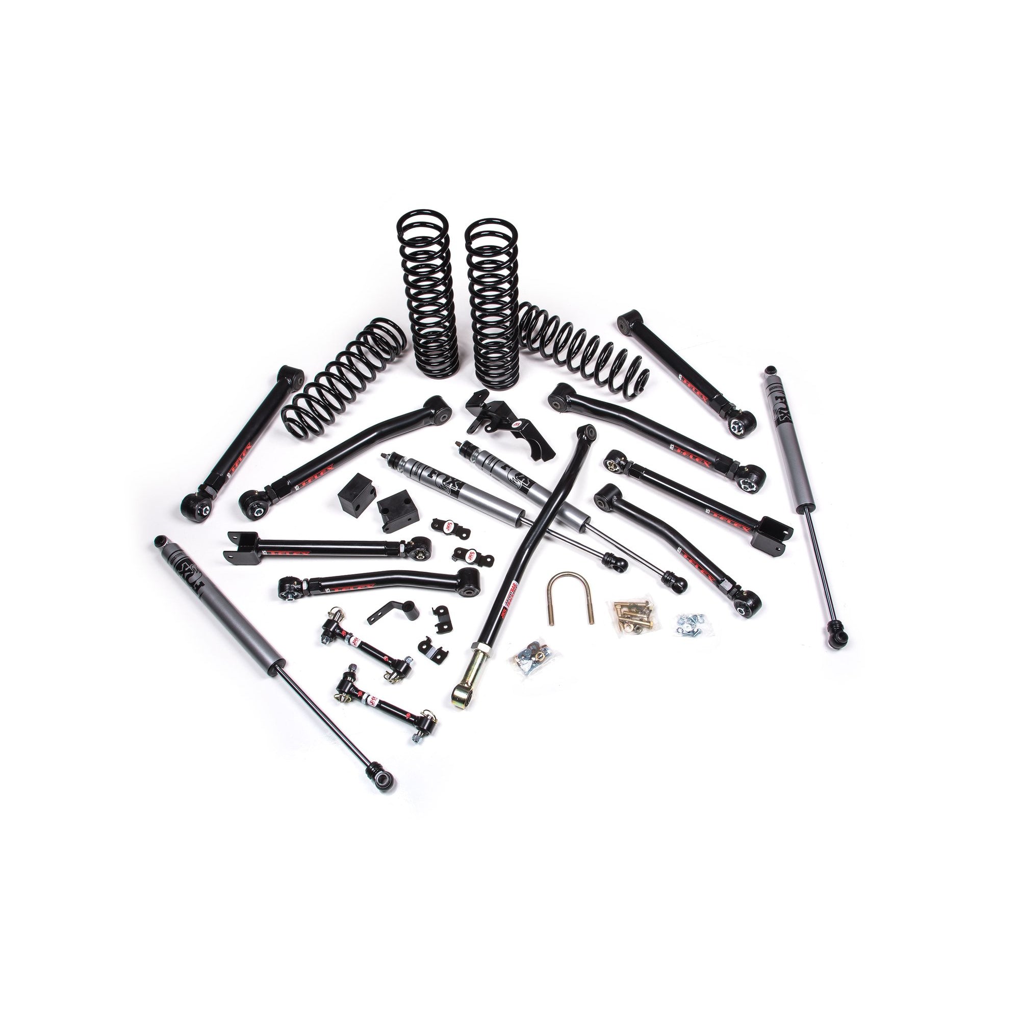 Turn your 4 Door Jeep Wrangler JK into a serious off road rig with a JKS J-Krawl 2.5" lift kit. Designed for maximum articulation and adjustability, the complete suspension system includes dual rate coil springs, adjustable front track bar, rear track bar bracket and tuned FOX shocks. The heart of the J-Krawl design is a set of J-Flex upper and lower control arms and sway bar Quicker disconnects. These systems build off Jeep's factory suspension mounting points and upgrades to front and rear, upper and lower J-Flex adjustable control arms for maximum articulation along with more strength for trails and rock crawling brawn along with adjustability to dial in front caster, rear pinion and overall vehicle wheelbase. In addition to eight high strength adjustable control arms, the J-Krawl system features specially designed FOX 2.0 Remote Reservoir shocks to maximize travel and performance. An aftermarket front driveshaft is strongly recommended due to additional travel capable. Routine maintenance is required.