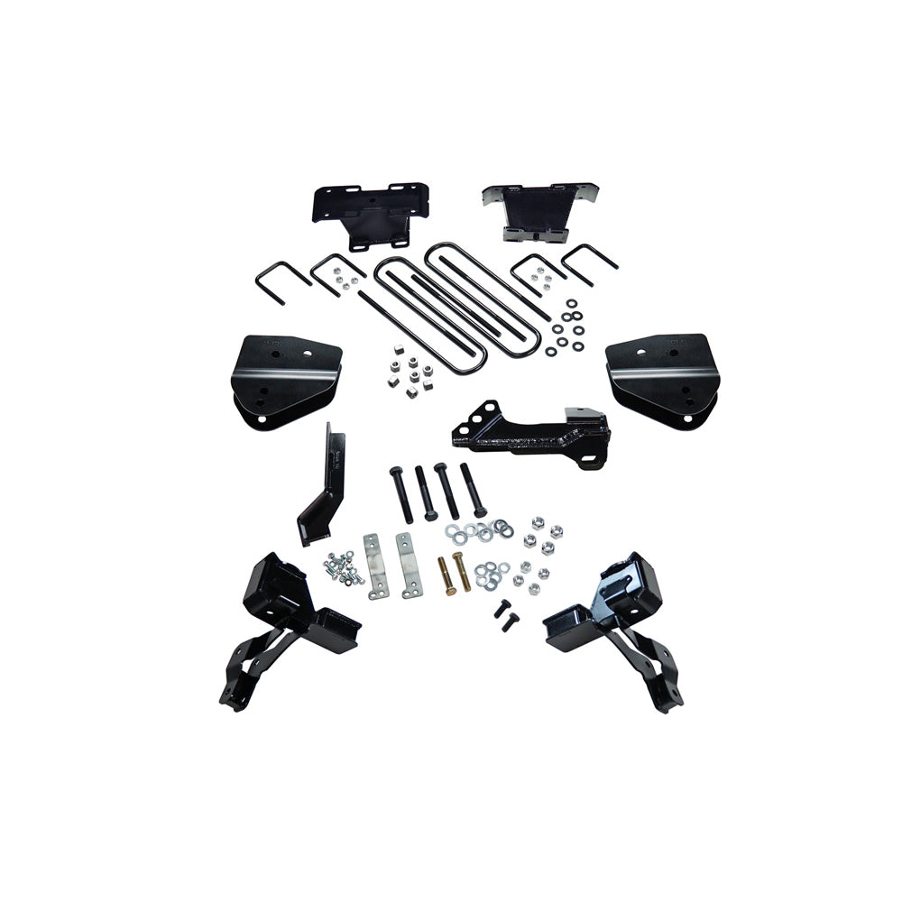 Front coil spring spacers, shock brackets, track bar bracket, radius arm drops, brake line brackets, steering stabilizer bracket and all hardware needed for installation |