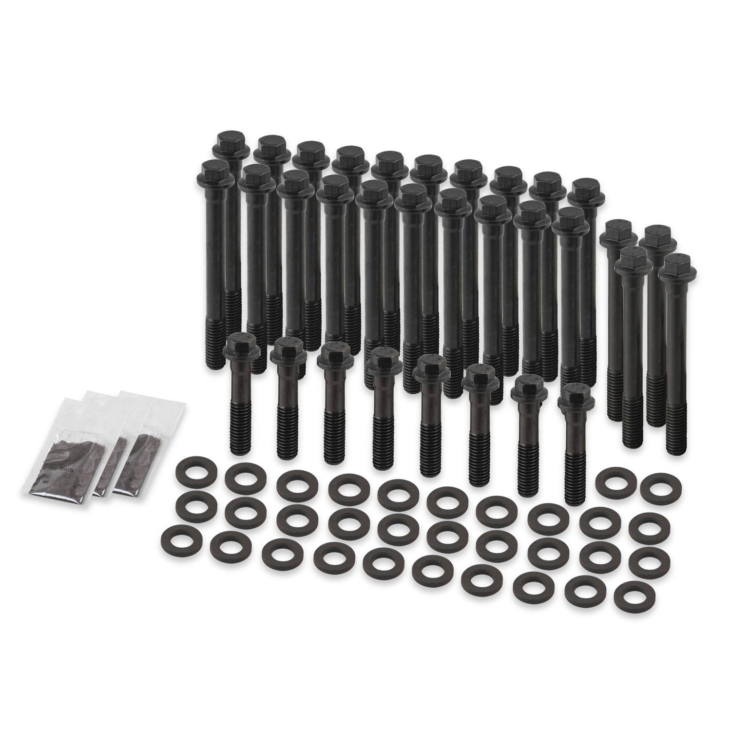 Earl's Racing Products head bolts are made from premium quality 170,000 psi chrome moly alloy steel (about 15% stronger than Grade 8). These bolts have a reduced wrench size (choose from 12-point or hex head) for extra socket clearance (provides extra clearance to rocker arms when re-torqueing heads). The wide flanged head provided more support for the extra thick chrome moly washers. These head bolts are reusable and are the ideal way to upgrade the performance of your engine, and eliminate the hassle and cost of replacing factory style torque-to-yield style bolts each time the cylinder heads are removed. Black oxide finish & sold in complete engine sets. Made in the USA.
