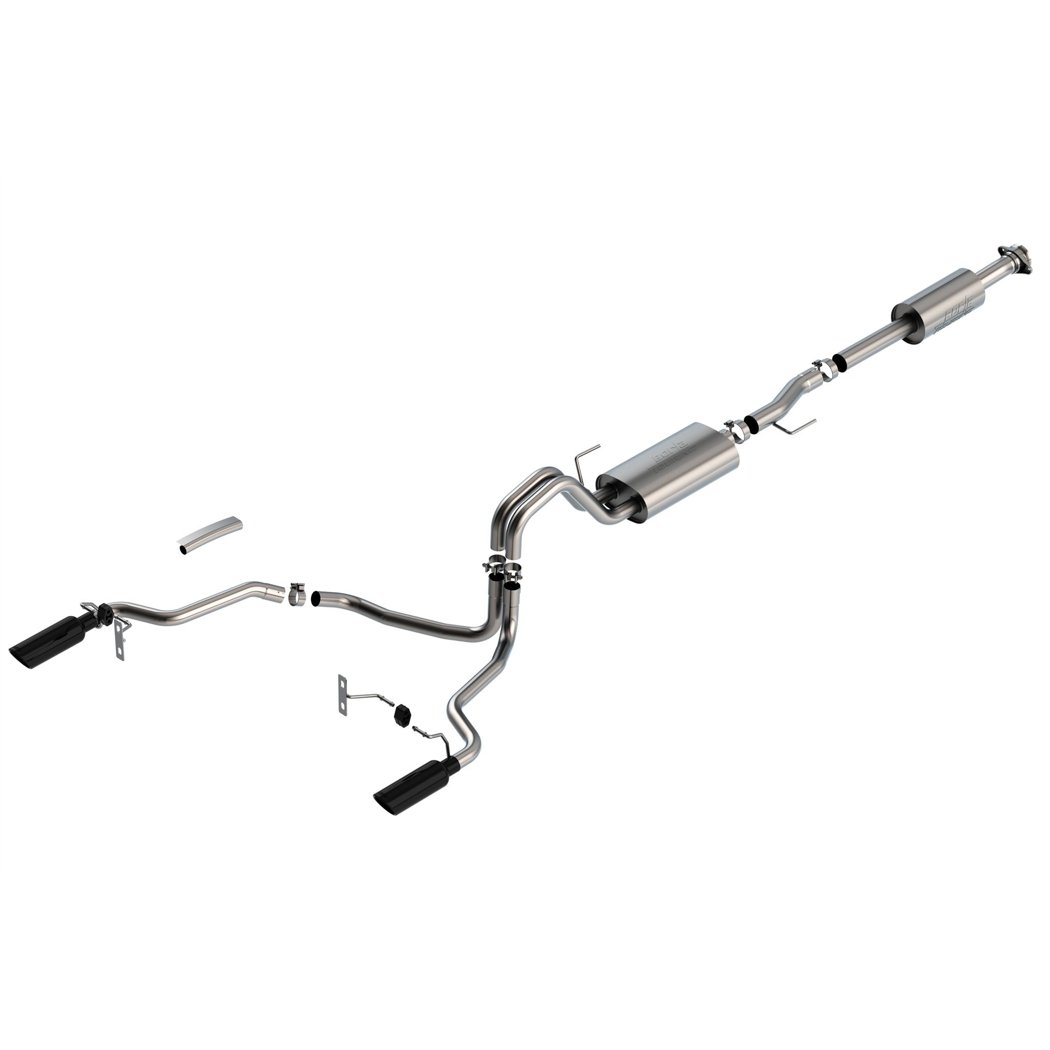 Description_MKT | EXCEPT 3.5L V6 PowerBoost, Tremor, and Black Appearance Package. The BORLA(r) Cat-Back(tm) system 140862 was specifically designed to enhance the power and sound of the Ford F-150 equipped with 2.7L and 3.5L Engines. It includes 4" black chrome on T-304 stainless steel tips and a split rear exit configuration. Using BORLA(r) Stainless Steel Polish p# 21461 is NOT recommended with these 4" black chrome tips. We suggest cleaning the tips with hot water and a microfiber cloth. The entire system is made of T-304 stainless steel and utilizes computer numerical control (CNC) manufacturing techniques that ensure an accurate fit. This system features the Touring sound that gives you a mild sound of power with no drone. It is also available with bright chrome tips (part number 140862). There are additional systems available for the 2.7L and 3.5L F-150 that offer different options for sound level, tip finish and tip Exits. Add Adapter 60556 for Crew Cab with Standard Bed (6' 7 ) 157.2" Wheelbase vehicles. Add Adapter 60564 for Extended Cab with Long Bed (8' 2") 164.1" Wheelbase vehicles. All this is backed by our unsurpassed Million Mile Warranty. |