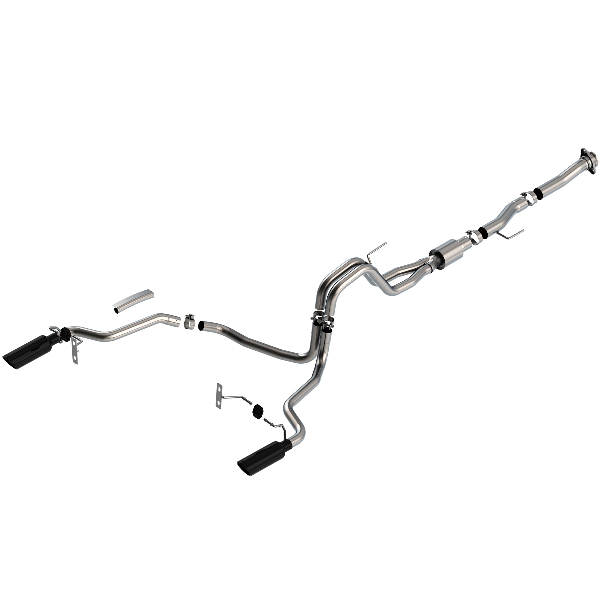 Description_MKT | EXCEPT TREMOR and Black Appearance Package. The BORLA(r) Cat-Back(tm) system 140869BC was specifically designed to enhance the power and sound of the Ford F-150 equipped with the 5.0L V8 engine. It includes 4" black chrome on T-304 stainless steel tips and a split rear exit configuration. Using BORLA(r) Stainless Steel Polish p# 21461 is NOT recommended with these black chrome tips. We suggest cleaning the tips with hot water and a microfiber cloth. The entire system is made of T-304 stainless steel and utilizes computer numerical control (CNC) manufacturing techniques that ensure an accurate fit. This system features the ATAK(r) sound that gives you our most aggressive sound level with no drone. It is also available with bright chromed tips (part number 140869). There are additional systems available for the 5.0L F-150 that offer different options for sound level, tip finish and tip Exits. Add adapter 60564 for Regular Cab with Long Bed (8' 2") 141.5" wheelbase vehicles. All this is backed by our unsurpassed Million Mile Warranty. |
